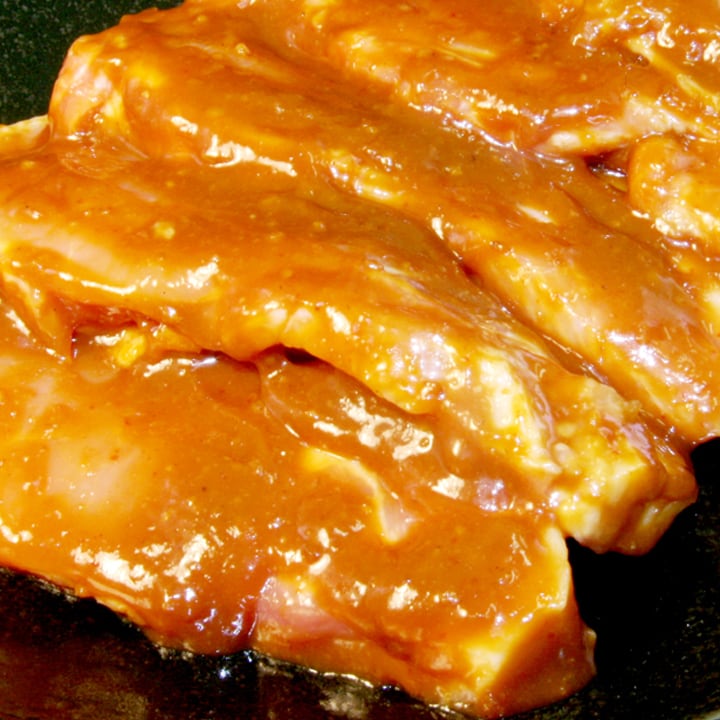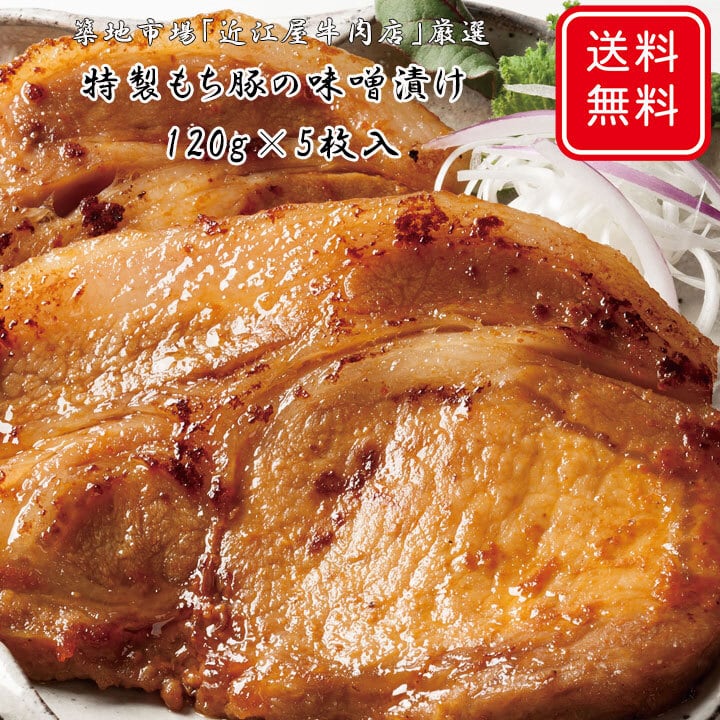 開発に開発を重ねられた和製もち豚を、築地市場の近江屋牛肉店が試行錯誤を繰り返した秘伝の味噌ダレにしっかりと漬け込んだ特製味噌漬けの逸品です。キメが細かくもち肌のようなもち豚は、焼くだけでも十分に美味しい肉ですが、特製味噌に漬け込むことによって、ジューシーで甘味のある脂身とそのやわらかな肉質は至福の味わいが楽しめます。特製ダレは、米味噌と麦味噌を合わせ、そこにピーナッツバターや焙煎にんにくなど様々なスパイスをブレンドし熟成させていますからしっかりとしたコクのある味付けです。焼くときは、軽く味噌を落としてからゆっくりと焼きあげていただくと、焦げ付きにくく美味しく召し上がっていただけます。火を通し過ぎると固くなってしまいますのでご注意ください。
